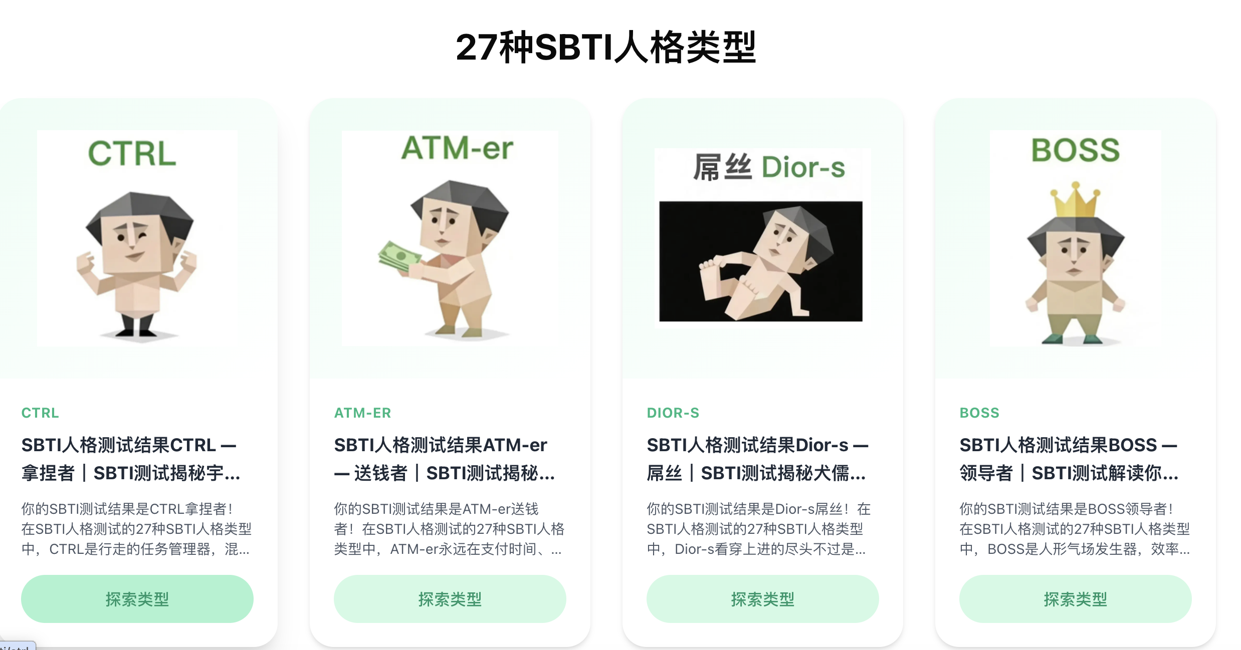 现在就去参加SBTI人格测试,让系统告诉你,你到底是哪种人格。也可以浏览全部27种SBTI人格类型,看看你身边的人都是什么类型。